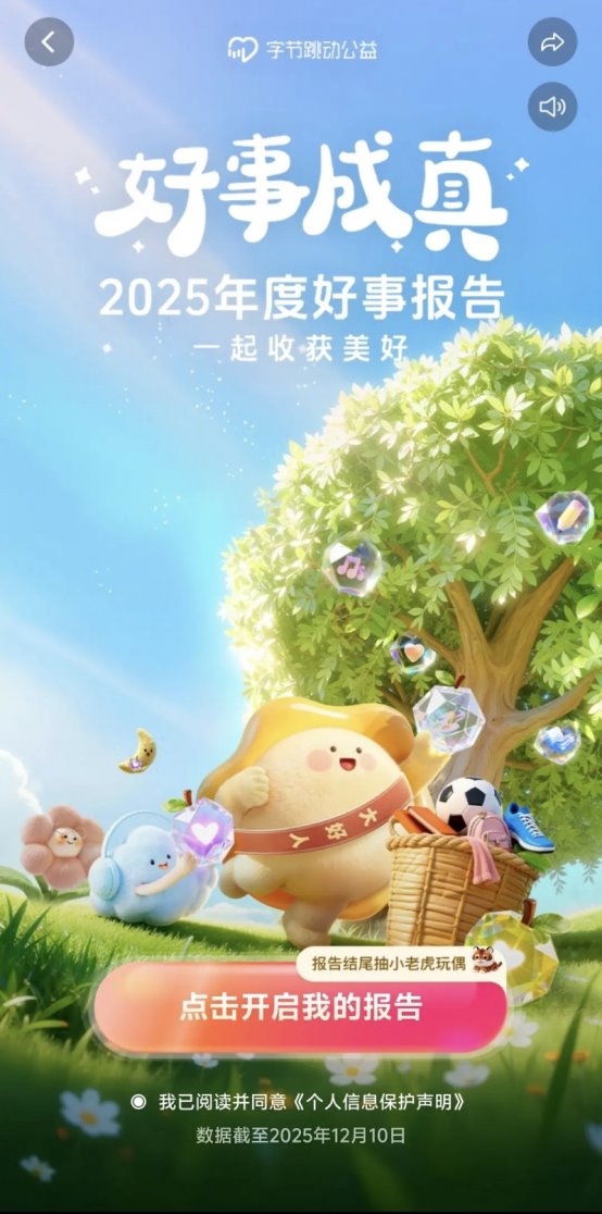 近日,字节跳动公益发起“好事成真”公益活动,同步上线年度好事报告,用户可从受助人视角追溯善款去向。活动吸引超8200名创作者投稿,60万用户通过报告获取受助人反馈,直观感受公益价值。