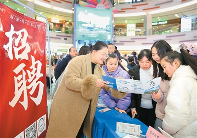图为连云区人社局工作人员(左)给高校毕业生介绍“连云人才新政”。