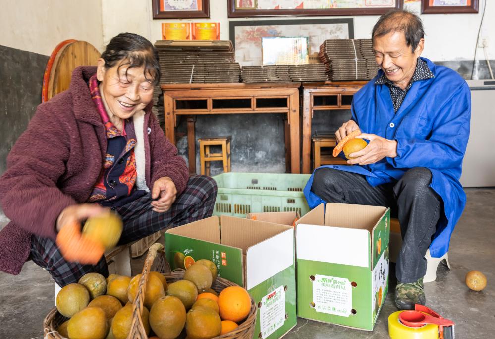 4月23日,周功寿(右)直播接单后,与老伴王学凤在自家客厅包装脐橙准备发快递。
