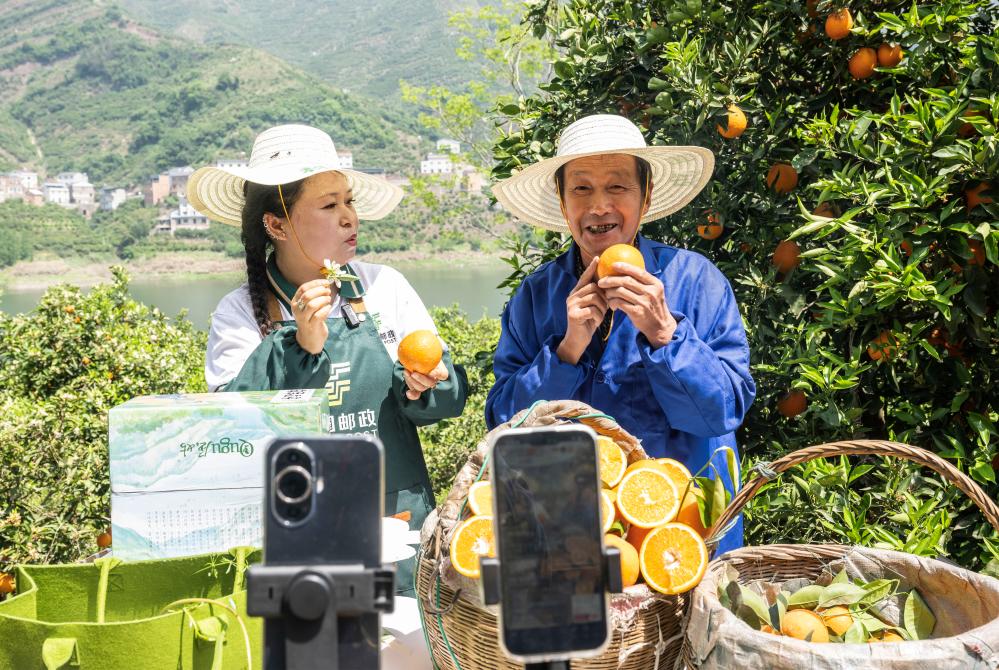 4月23日,周功寿(右)在脐橙园里直播,老伴王学凤在采摘脐橙。