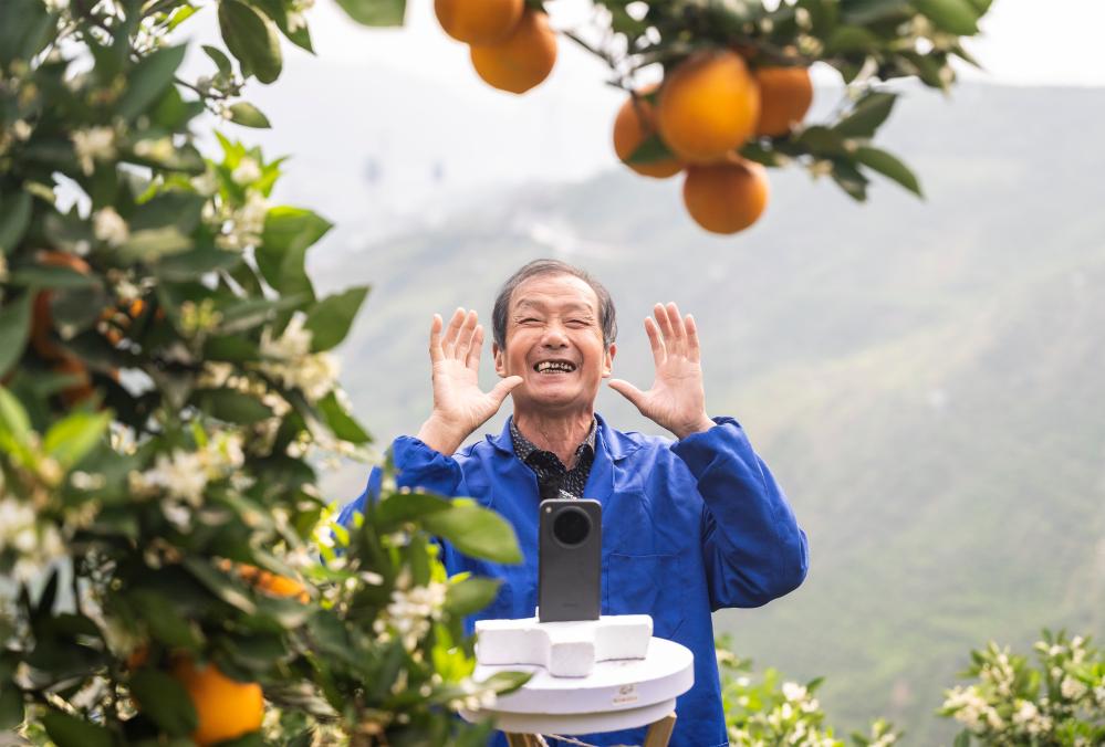 四月的三峡,峡江两岸山花遍野,沉甸甸的脐橙挂满枝头,花果同枝的盛景格外喜人。“大家好!我是秭归猴哥……”洪亮的声音从果园里传来——七旬老人周功寿正对着手机直播,脐橙的果香仿佛透过屏幕扑面而来。