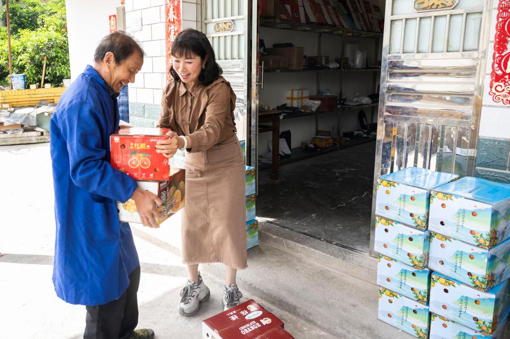 4月23日,周功寿(左)将包装好的脐橙送到村内的快递点发货给客户。